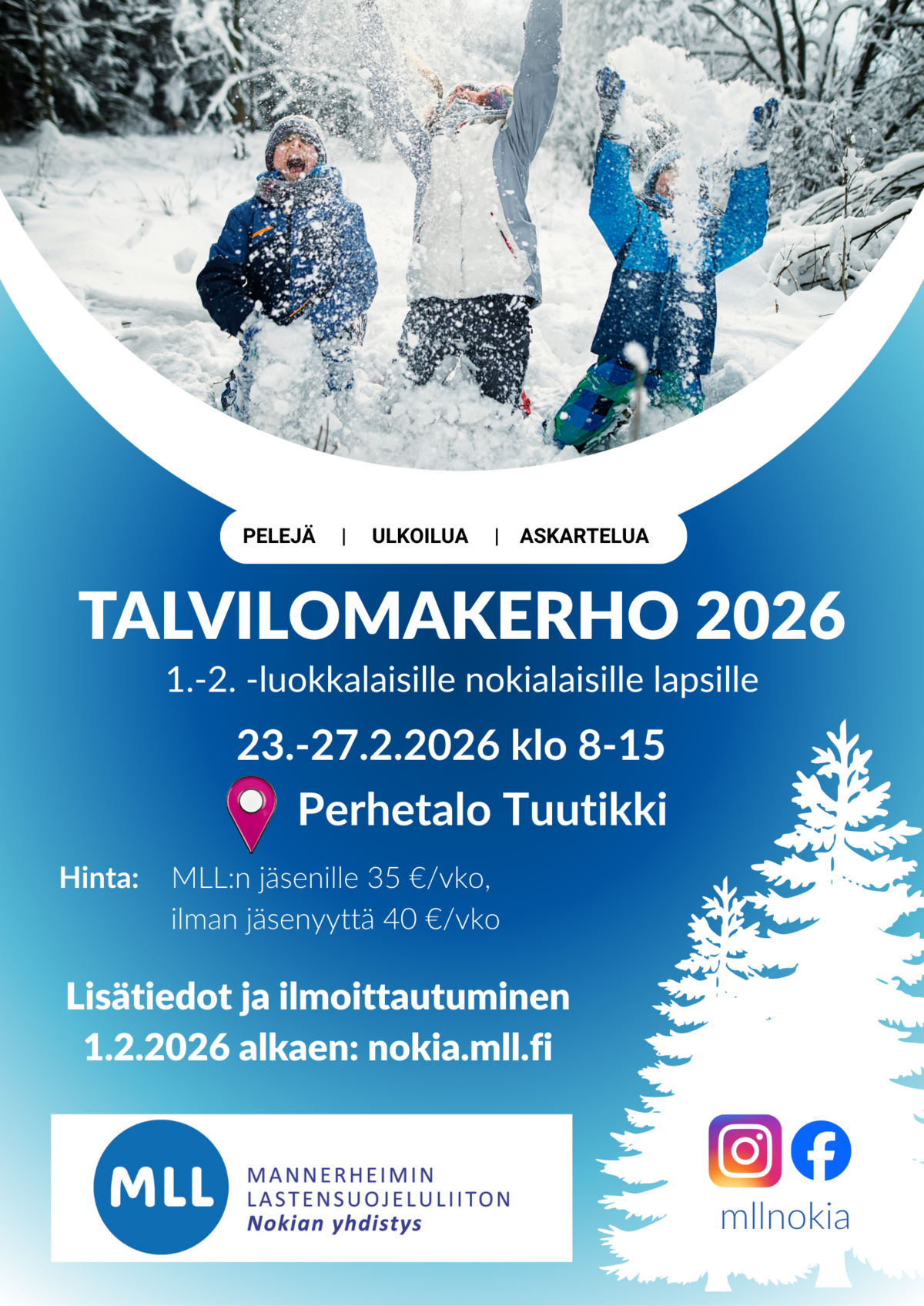 Kerhoviikon hinta on 35 € MLL Nokian yhdistyksen jäsenille, muille 40 €. Iltapäiväkerhoihimme osallistuville kerhoviikko on maksuton. Lapset ovat kerhon ajan vakuutettuja.